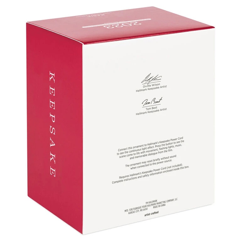 - Key Features: Connect this Magic Light, Sound and Motion ornament to Hallmark’s Keepsake Power Cord (sold separately) to see the continuous light effect. Press the button to see the scene come to life with movement, flashing lights, music and memorable dialogue from the film. The ornament may reset briefly without sound when connected to the power source.
